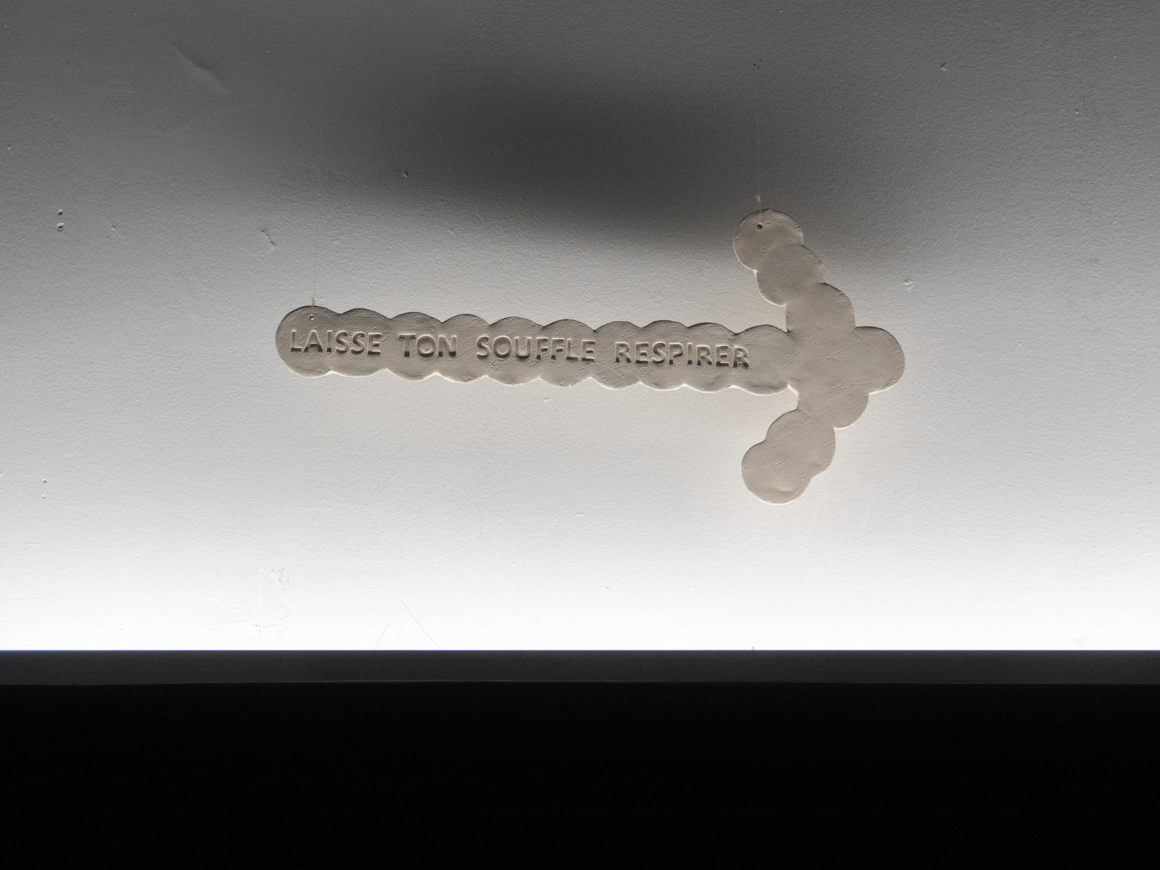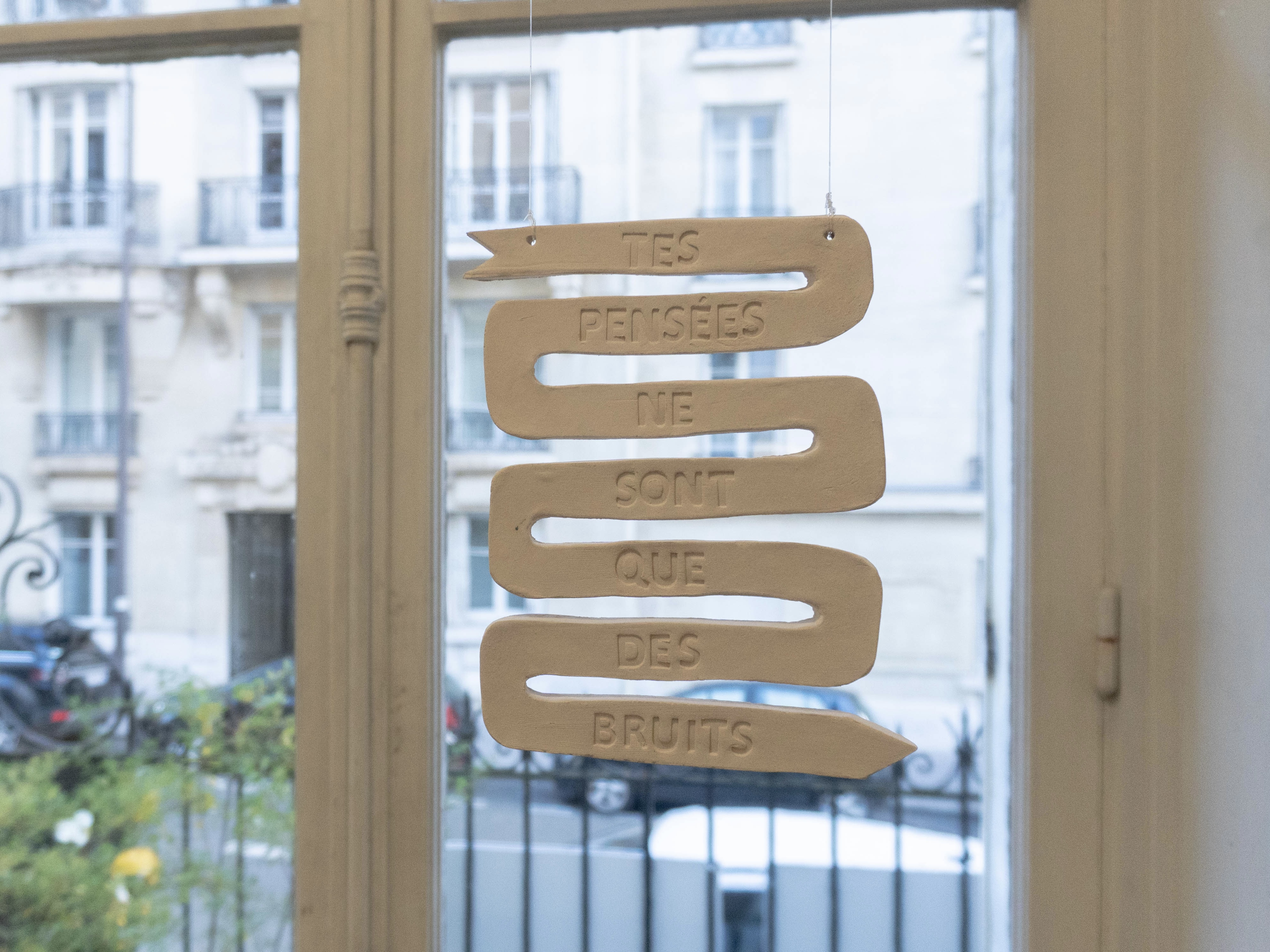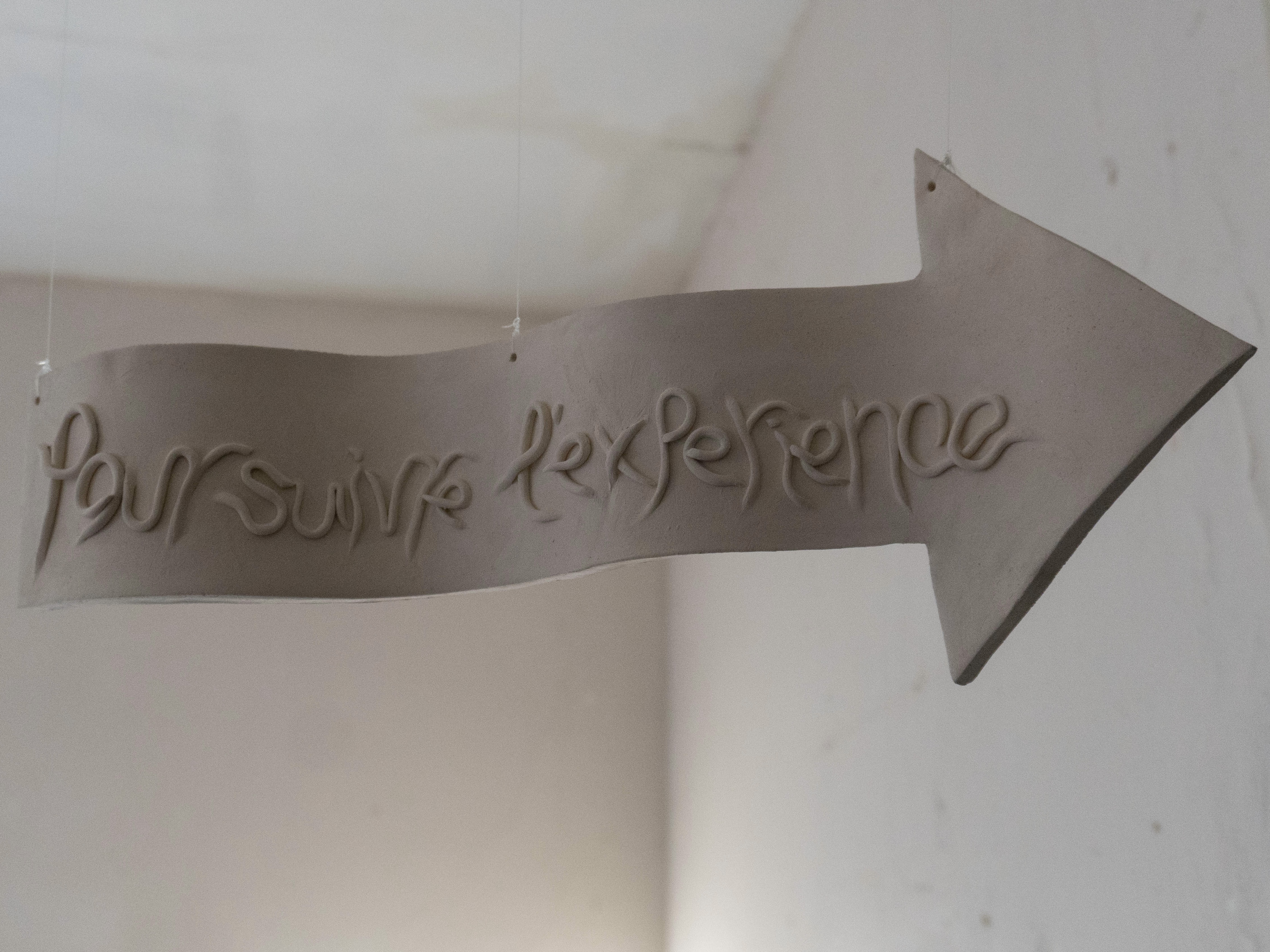 With her series of ceramic objects hung freely around La Maison Bruneau, the artist suggests for the guests to integrate the mental with the material and invites them on a meditative journey of exploring themselves through inspecting the house. The arrows are there to guide the explorer on both levels through spiritual phrases written on them and the physical directions they point to.