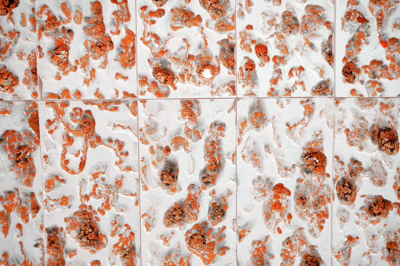 The title of the work refers to the ‘emerging’ position of it on the wall and to the alarming state of the environment. The boards that constitute the installation are, in everyday life, hidden from our sight underneath finishing layers of priming, plastering and paint, but in this case, the hidden layer is brought out to sight, together with the implications it carries.